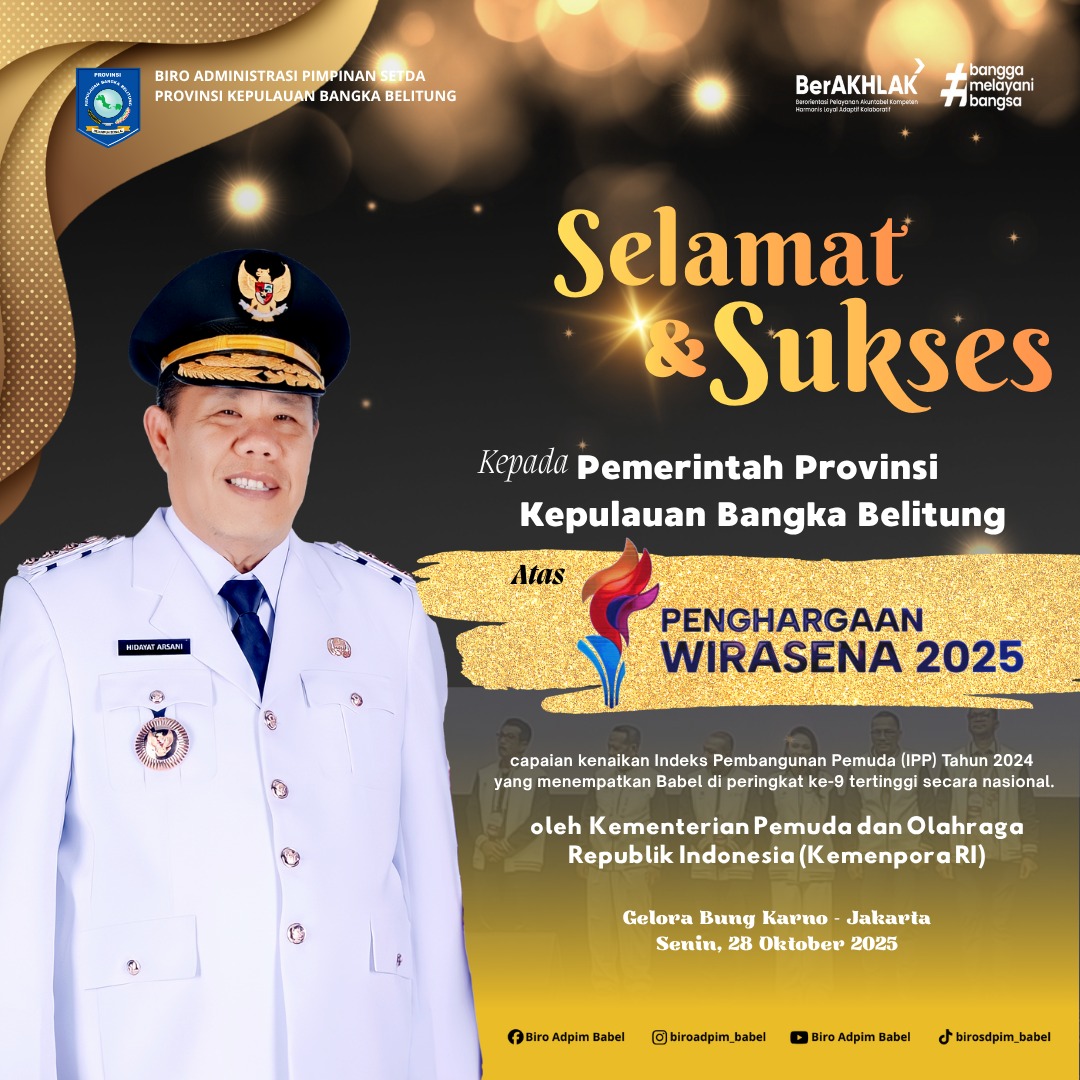 JAKARTA, KATABABEL.COM — Provinsi Kepulauan Bangka Belitung (Babel) kembali menorehkan prestasi di tingkat nasional. Pada peringatan Hari Sumpah Pemuda (HSP) ke-97 Tahun 2025, Kementerian Pemuda dan Olahraga Republik Indonesia (Kemenpora RI) menganugerahkan Penghargaan Wirasena 2025 kepada Pemerintah Provinsi (Pemprov) Babel, atas capaian kenaikan Indeks Pembangunan Pemuda (IPP) Tahun 2024 yang menempatkan Babel di peringkat ke-9 tertinggi secara nasional.