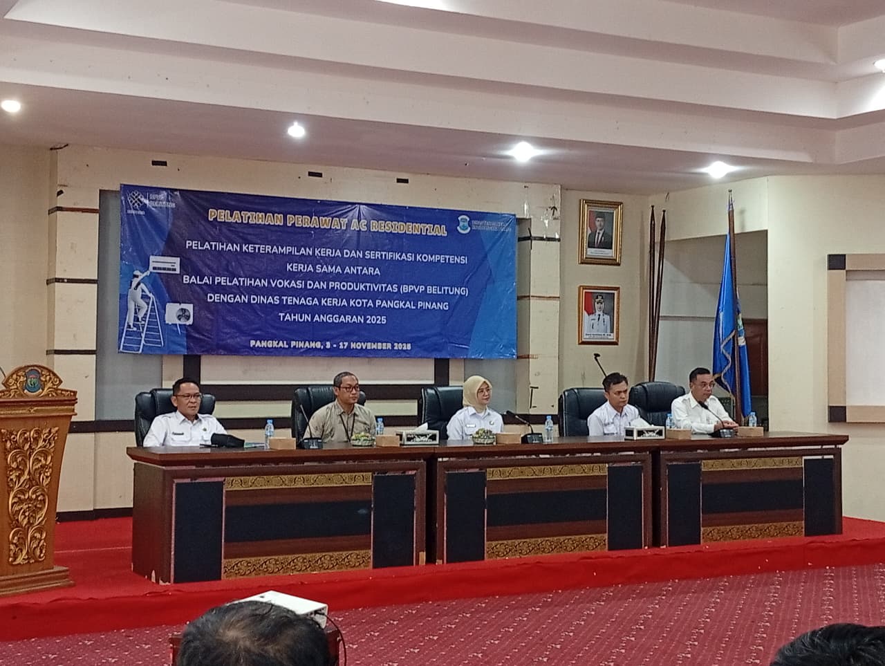 PANGKALPINANG, KATABABEL.COM — Pemerintah Kota Pangkalpinang kembali menghadirkan program peningkatan keterampilan kerja bagi masyarakat. Wakil Wali Kota Pangkalpinang, Dessy Ayutrisna, secara resmi membuka Pelatihan Perawat AC Residensial, hasil kerja sama antara Balai Pelatihan Vokasi dan Produktivitas (BPVP) Belitung dengan Dinas Tenaga Kerja Kota Pangkalpinang, pada Rabu (5/11/2025) di Balai Besar Betason.