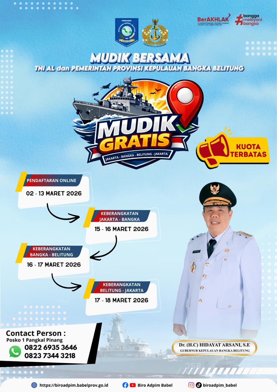 PANGKALPINANG, KATABABEL.COM — Pemerintah Provinsi Kepulauan Bangka Belitung (Pemprov Babel) bekerjasama dengan TNI Angkatan Laut menghadirkan program mudik gratis bagi masyarakat perantauan sebagai bentuk perhatian dan kepedulian kepada warga yang ingin pulang ke kampung halaman untuk merayakan Hari Raya Idulfitri bersama keluarga.