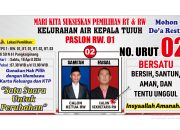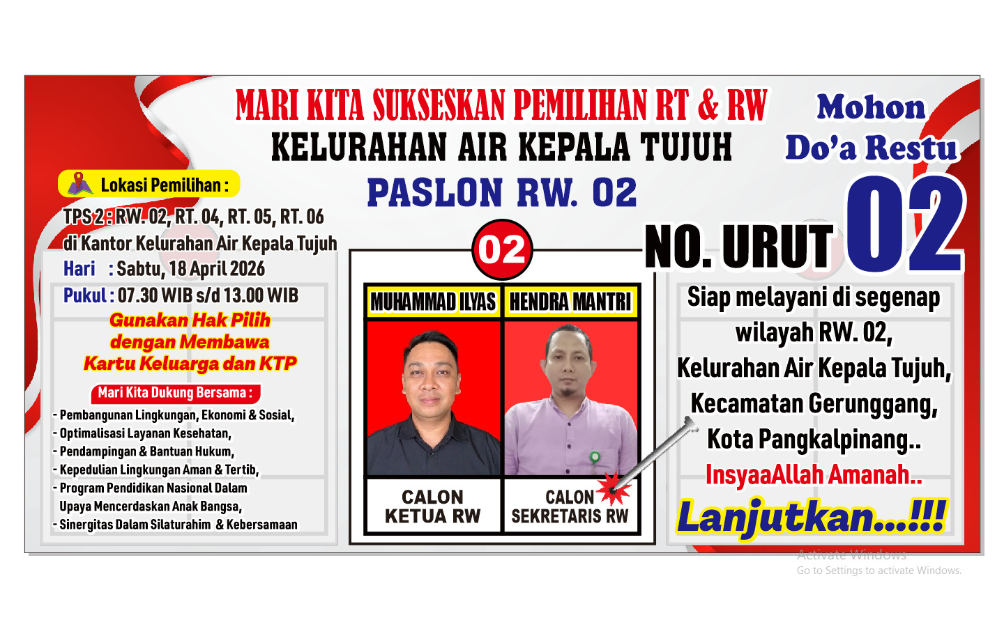 Dalam sosialisasinya, pasangan ini mengajak seluruh warga untuk bersama-sama menyukseskan pemilihan dengan datang ke Tempat Pemungutan Suara (TPS). Adapun TPS 2 akan melayani warga RW 02 yang mencakup RT 04, RT 05, dan RT 06, yang berlokasi di Kantor Kelurahan Air Kepala Tujuh. Pemungutan suara dijadwalkan berlangsung mulai pukul 07.30 WIB hingga 13.00 WIB.