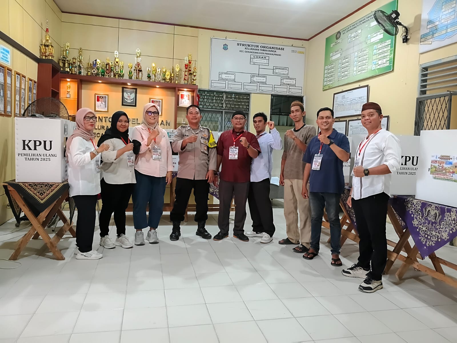 Sejak pagi hari, suasana di Kantor Kelurahan Taman Bunga tampak ramai dipadati warga yang datang silih berganti untuk menggunakan hak pilihnya. Antusiasme masyarakat terlihat dari antrean pemilih yang tertib mengikuti proses pemungutan suara di Tempat Pemungutan Suara (TPS) yang telah disiapkan panitia.